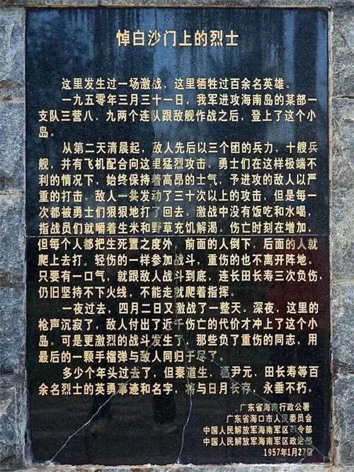 渡海作战纪念广场、纪念碑位于白沙门公园北端,数度瞻仰,每每肃然起敬。纪念碑正面有朱德总司令题写的“渡海英雄永垂不朽”8个熠熠生辉的大字,纪念碑背面刻有《悼白沙门烈士》的碑文,短短文字,千古不朽。