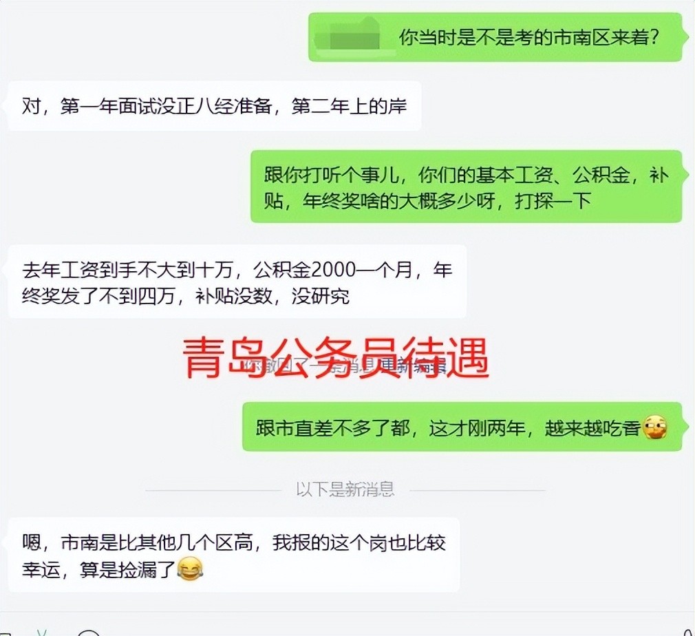 我们接下来聊聊山东青岛的公务员工资待遇,与山东青岛市南的小伙伴聊天得知(聊天记录如下):