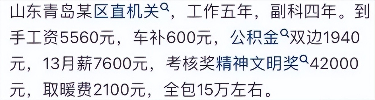 近年来,公务员普遍在降薪,但在青岛某区直机关工作五年的副科级公务员(应该是硕士研究生学历),到手工资5560元,车补600,公积金双边1940元,还有各种奖总计42000,全年收入能达到15万左右。