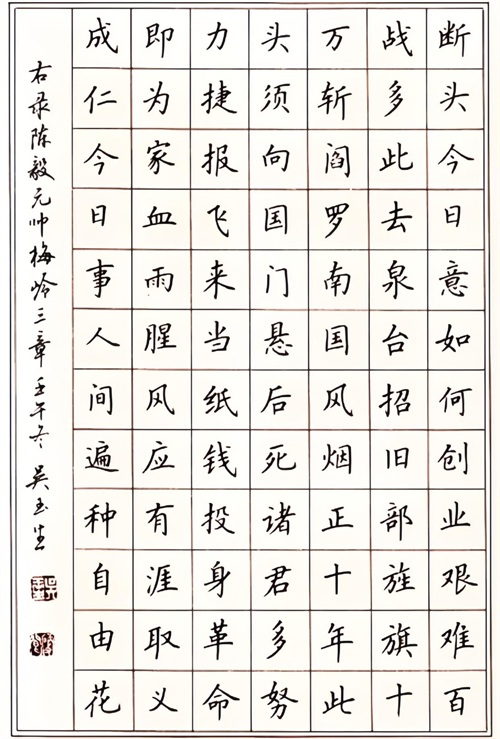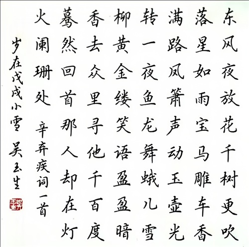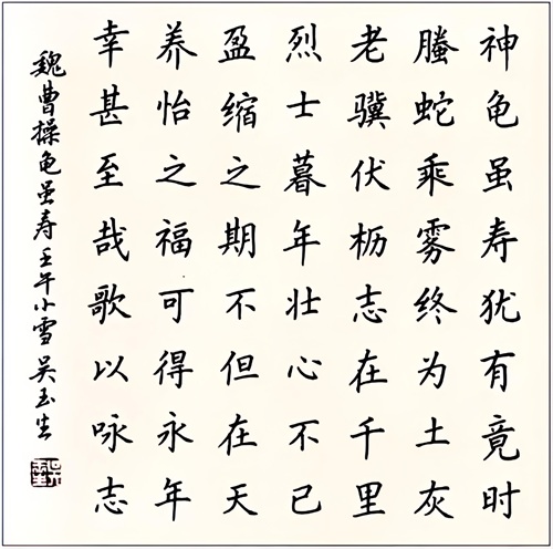 “古人学问无遗力,少壮工夫老始成”,吴玉生如今的笔下坦然、心之淡然,都是多年来的积累,使其成为软笔、硬笔都颇有建树的书家,特别是他的硬笔行楷,更是代表了当今硬笔书坛的一流水平,其书法结构严谨,清秀洒脱,灵性十足,深受广大书法爱好者的喜爱与欢迎。
