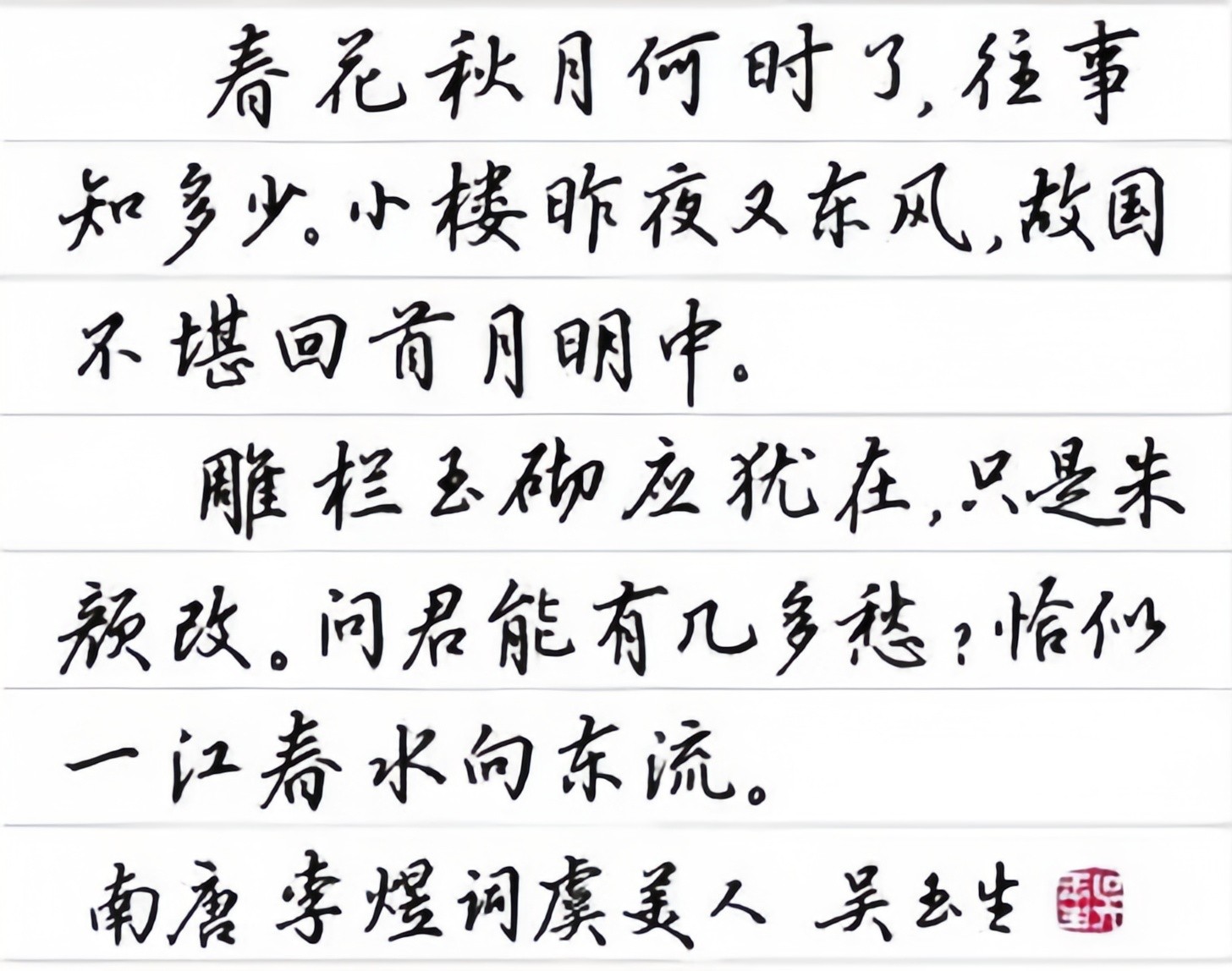 吴玉生,出生于1959年,江苏人,当代著名硬笔书法家。他酷爱书法,多年临池不辍,具备十分扎实的书法基本功,曾获全国首届文明杯书写大赛唯一特等奖、名列中国汉字首届硬笔书法大赛一等奖榜首,担任过中国硬笔书法研究会副秘书长、华艺硬笔习字会副会长、中国书协函授培训中心副教授、中央电视台硬笔书法讲座主讲人和全国、全军书法赛事评委等职。