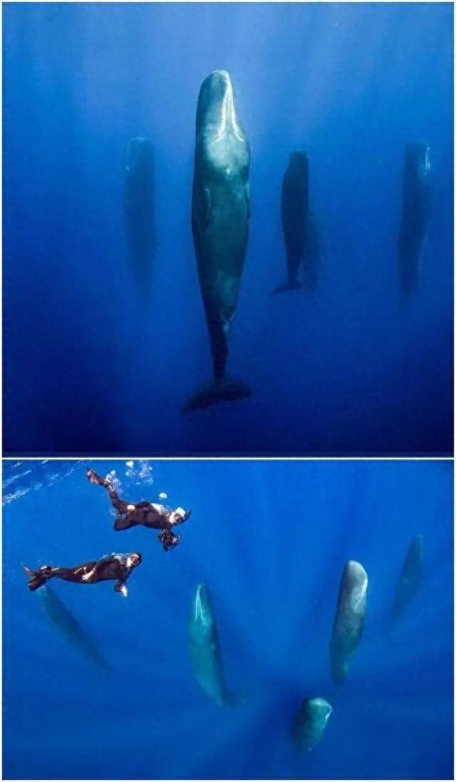 第1张:《抹香鲸的独特睡姿》:抹香鲸因为肺部位于身体前半段且密度低于尾部,所以睡觉时呈“站”立姿势,由于它们喜欢群居,这种姿势也被称为水下巨石阵。