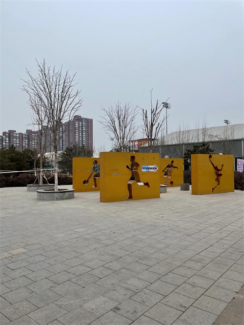 从西门进园,迎面是一个小广场,有花坛,绿植和几面黄色的运动姿态造型装饰墙。