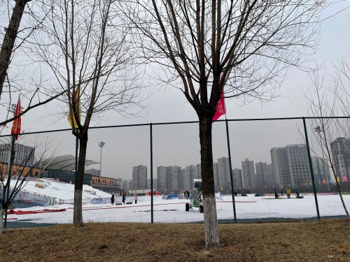 差不多绕到南侧,就可以看到完整的露天田径场,我曾经两次遇到这里在举办正式的体育赛事。现在正值冬季,运动场建起了冰雪世界,小火车、冰车在雪地上欢快地跑着,伴随着孩子们阵阵天真无邪的笑声,把欢乐的因子播撒的到处都是。