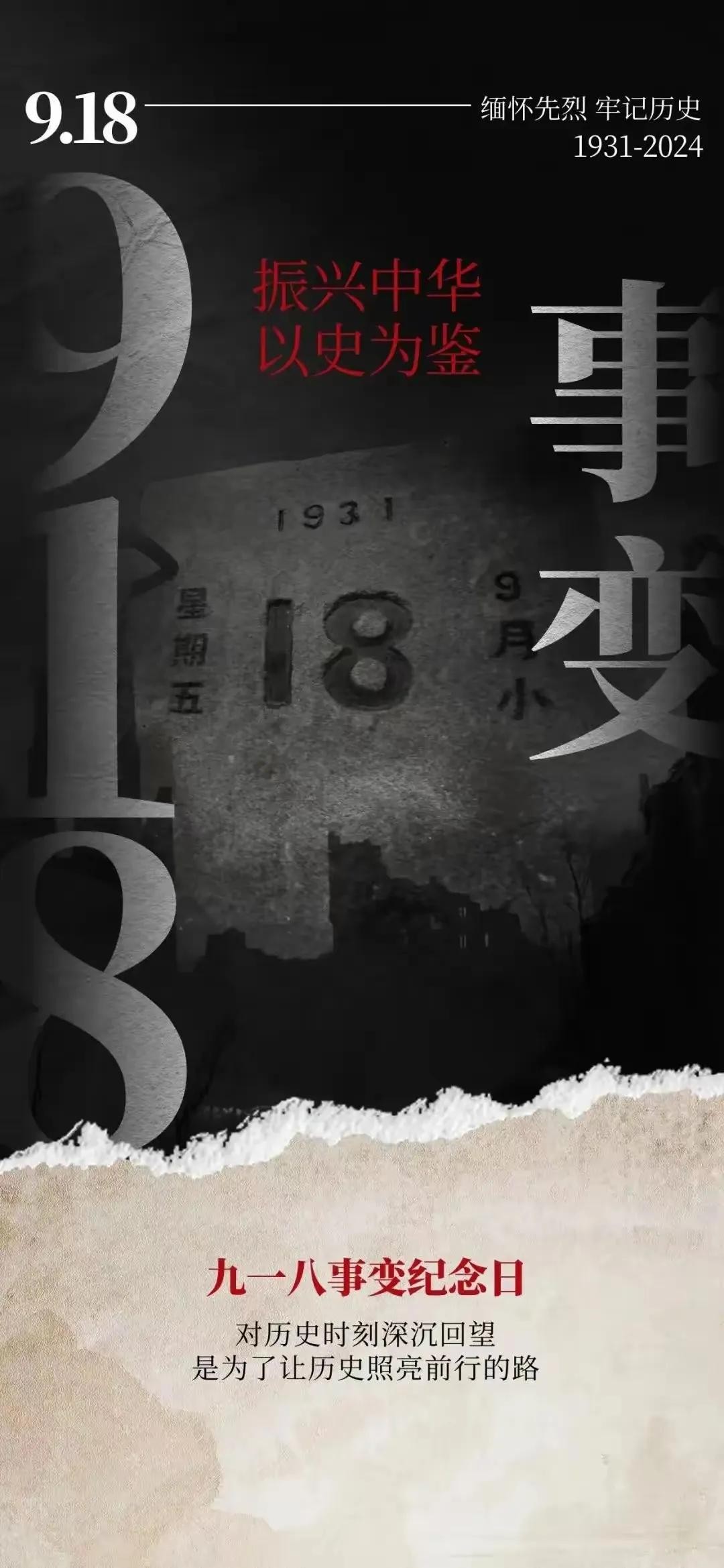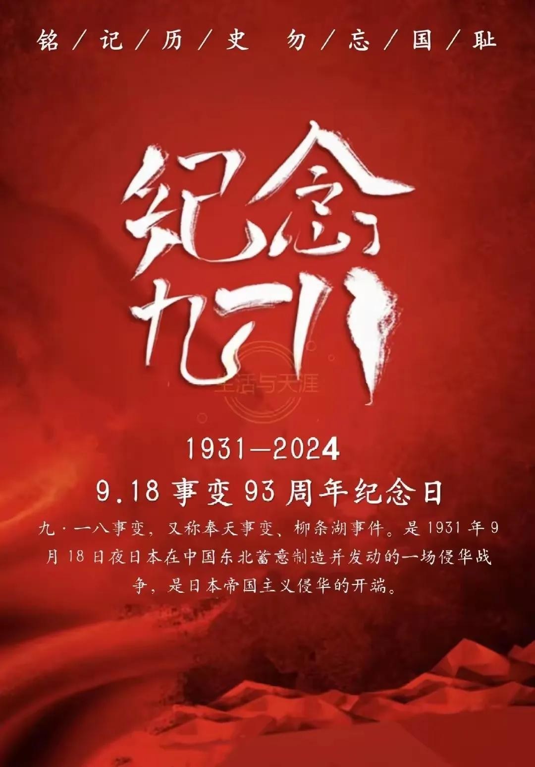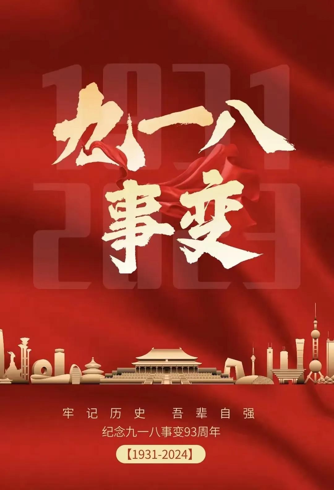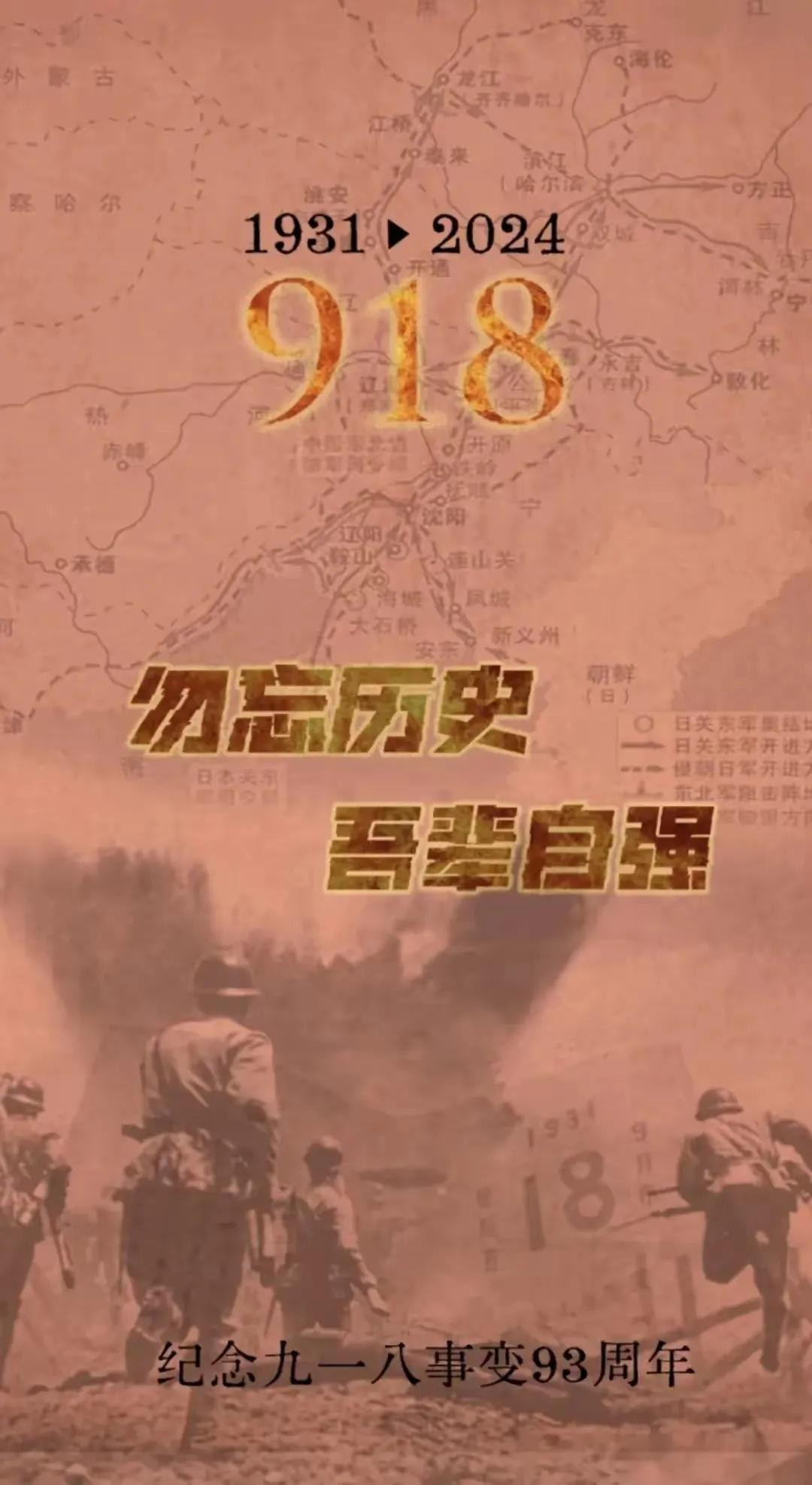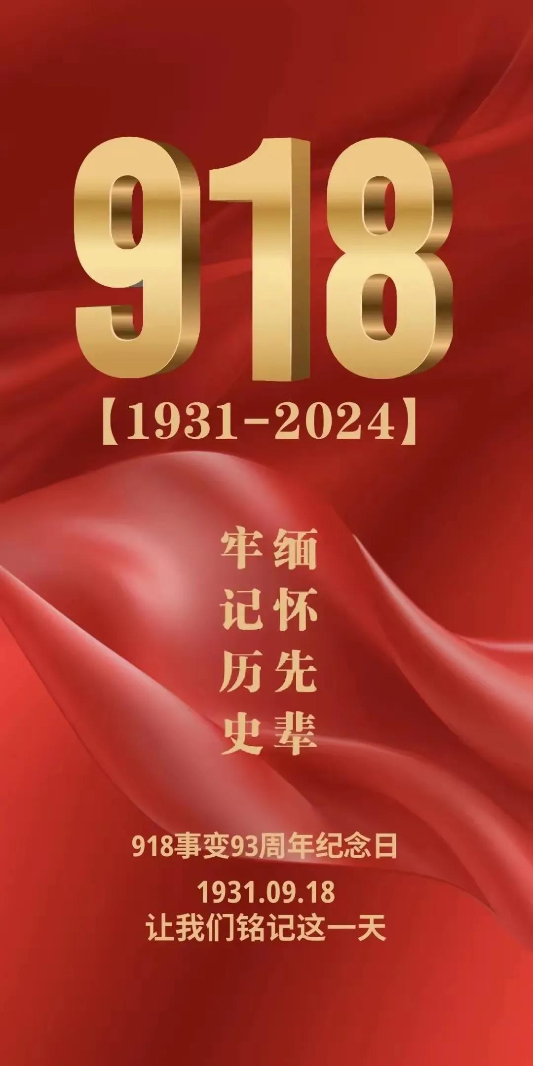 亲爱的朋友们,大家好,今天是2024年的9月18日,农历的8月16,星期三,今天是个特别的日子,是我们每一位国人都不应该忘记的日子,今天是九一八事变93周年纪念日,勿忘国耻,警钟长鸣,我们都应该居安思危。
