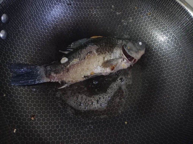 3、油锅里冷锅下油,烧热,然后把鲫鱼放进去煎一煎。