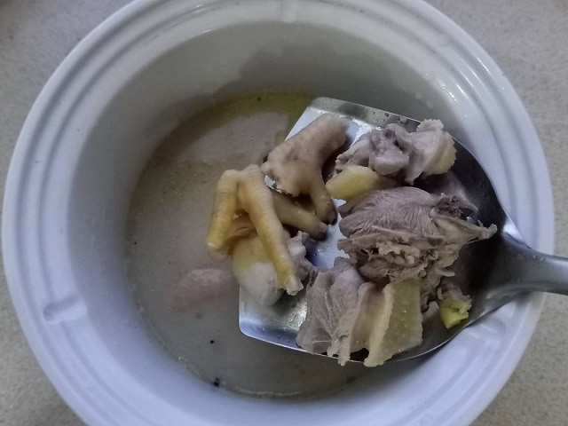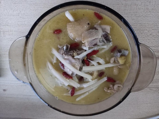 8、放入枸杞,用汤碗盛出,一碗鲜美无比的酸笋鸡皮汤就做好了。