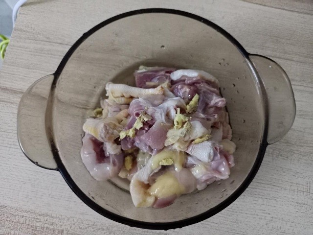 1、鸡肉斩成块,放姜丝、料酒腌制10分钟去腥。