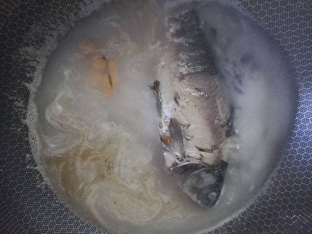 4、加入适量的水煮出奶白色的汤汁。