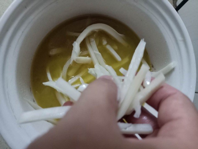 7、放入酸笋,再小火焖煮半个小时。