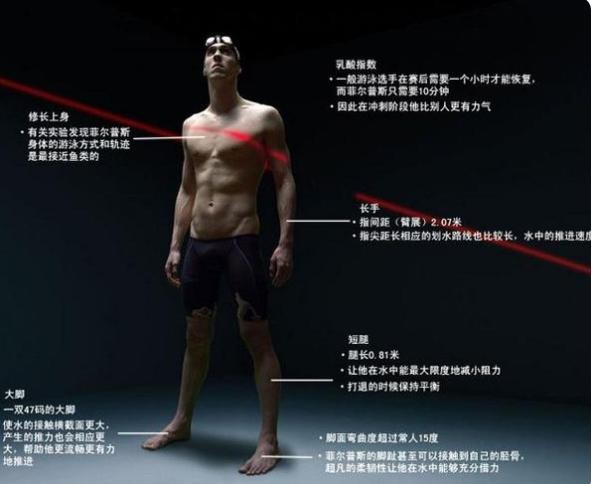 最后来看看菲尔普斯,他是公认泳坛第一人,被超越可能性几乎没有。他之所以能制霸泳坛,跟他完美身形有关。他的身形就是为了游泳而生,上身修长,脚大,乳酸指数低,手长,短腿,这些身体结构注定了菲尔普斯的不平凡,单届奥运会8金纪录,那基本是被永久封存了!