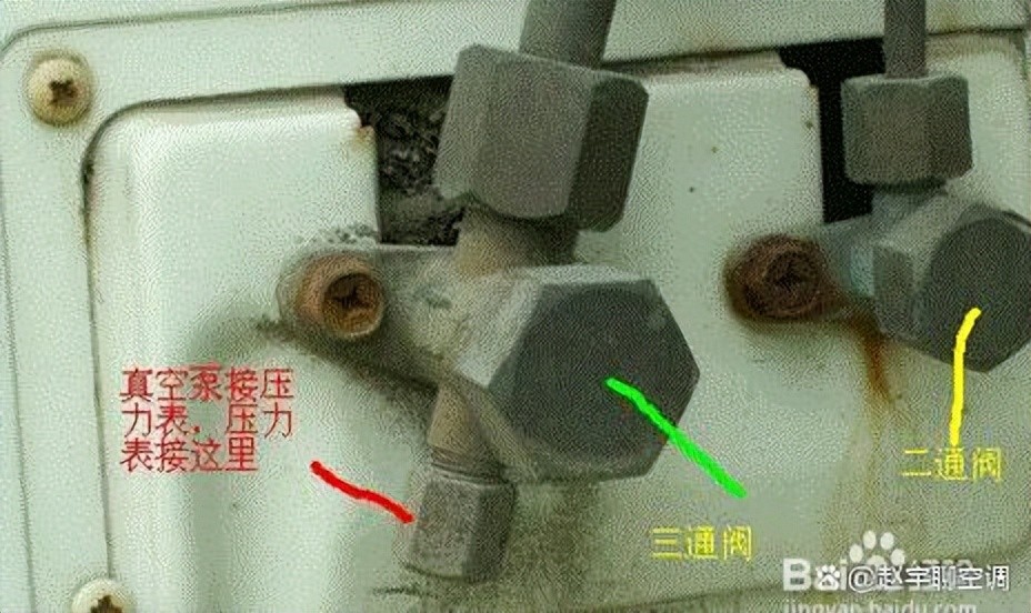 图片上面的细管接口为二通阀,粗管接口为三通阀,将阀帽拧下来将压力表的管线接上。