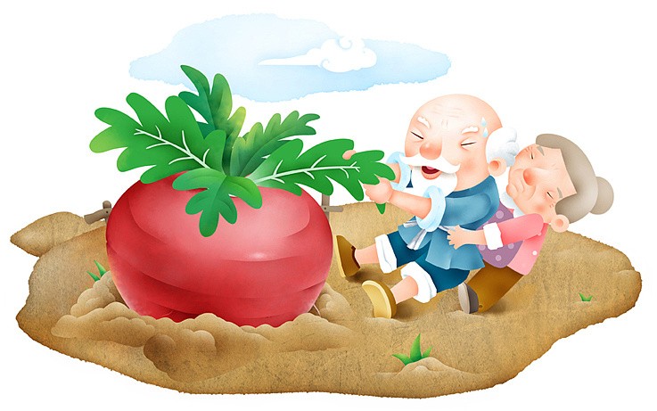 小老鼠拉着小花猫小花猫拉着小花狗,小花狗拉着小姑娘,小姑娘拉着老婆婆,老婆婆拉着老公公,老公公拉蒼萝卜的叶子,一起拔萝卜“嗨哟,嗨哟”拔呀拔,大萝卜有点动了,再用力地拔呀拔,大萝卜拔出来啦,他们高高兴兴地把萝卜抬回家去了。