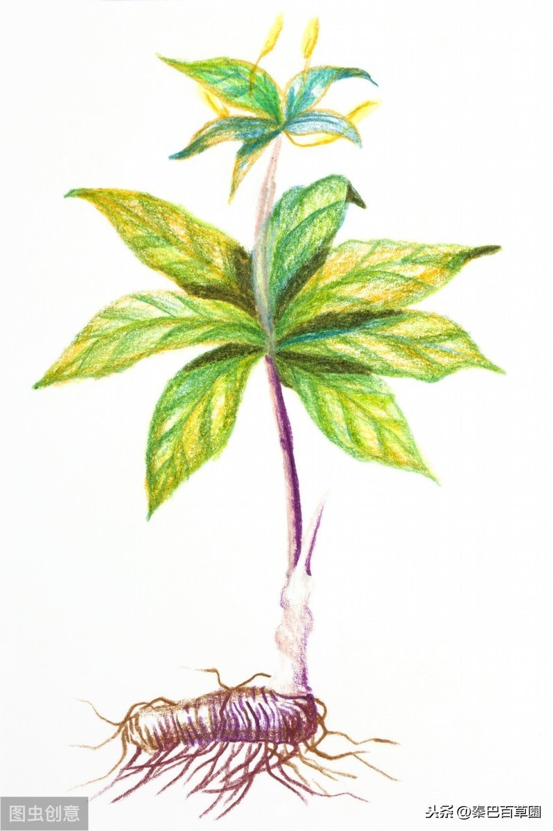 原形态:华重楼:多年生草本,高约50厘米。根状茎棕褐色,横走而肥厚,粗可达3厘米,表面粗糙具节,节上生纤维状须根。茎单一,直立,圆柱形,光滑无毛,基部常带紫红色。叶5-9,通常7片,轮生于茎顶,壮如伞,其上生花1朵,故称“七叶一枝花”;叶柄长1-3厘米,叶片纸质或膜质,窄卵形或倒披针形,长7-9厘米,宽2-5厘米,先端锐尖,基部楔形。夏季开黄绿色花,花梗由茎顶抽出,不分枝,多少比叶长,花单独顶生;萼片5-6,叶状,卵状披针形;花瓣5-6,细线形,有时上部稍扩大,宽约1.5毫米,通常较短于花萼;雄蕊2轮,药隔突出部分窄于花药,长0.2-2毫米;子房具棱,顶部于花柱为紫色,其余部分为黄绿色;蒴果室背开裂。七叶一枝花:形似中华七叶一枝花,但叶短圆形或倒披针状矩圆形,基部圆形或罕为急尖;花瓣丝状,近顶端渐变尖,长等于或长于花萼的2倍,宽约1毫米。