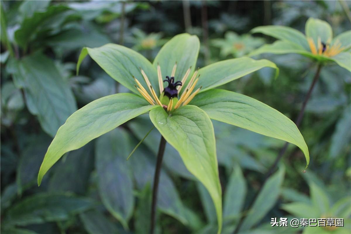 原形态:多年生草本,高35~60厘米,全株无毛。根茎粗壮,匍匐。茎直立,有纵条纹,绿色,有时带红色。叶通常为4片,有时5~7片,轮生于茎顶;叶柄长1~4.5厘米;叶片草质,广卵形,长7.3~11.5厘米,宽3.8~7.2厘米,先端短尖而微弯,全缘,基部略近心脏形或截形,主脉3条,基出。花单一,顶生,花柄长10.5~16厘米;花两性,外列被片4瓣,绿色,卵状披针形,长约3厘米,宽1~1.3厘米,先端渐尖,基部具短柄;内列被片4瓣,狭线形,黄绿色,长4.5~6.5厘米;雄蕊12,长约1.2厘米,花丝扁平,花药线形,药隔于顶端延伸成小尖头,长约1毫米;花柱4~5,先端反卷。浆果近于球形,直径约1.8毫米,外有宿存的花被;种子多数,近球形,淡褐色。花期6月。果期7~8月。