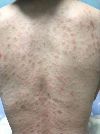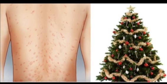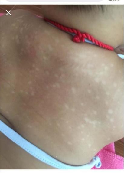 第二阶段(子斑):经过1~2周后,躯干、四肢近端和颈部分批出现与母斑相似的类椭圆形脱屑红斑,即子斑,直径一般在0.2~2cm左右,大小不等,常伴不同程度的瘙痒。典型者皮损长轴与皮纹走向一致,在躯干部呈“圣诞树样”分布。皮疹往往中心先愈,边缘红斑上覆以鳞屑。皮疹消退后,部分人会留下色素沉着或色素减退,一般会在几个月内消退。此外还有20%的玫瑰糠疹患者可出现不典型的皮损。
