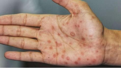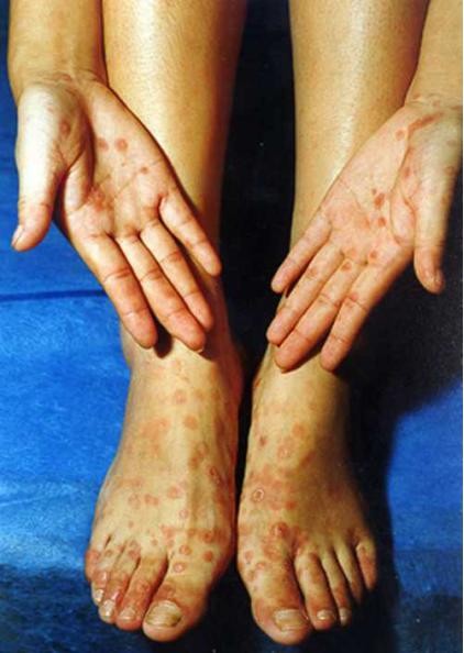 2、二期梅毒疹:有不洁性交史,皮疹分布广泛,数目多,无或少鳞屑,为大小一致的铜红色斑疹,常累及掌跖及粘膜。梅毒血清学检查阳性。