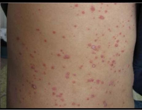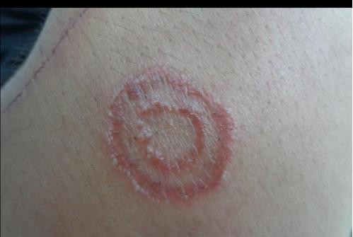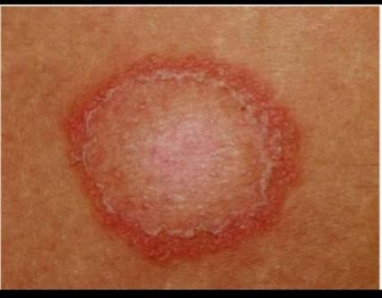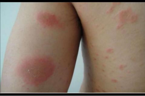 4、体癣:皮损边缘隆起,环状损害,界限清楚,中央有自愈倾向,瘙痒明显。除鳞屑外,有小丘疹或丘疱疹围绕。患者往往有手足甲癣的病史。真菌检查阳性。