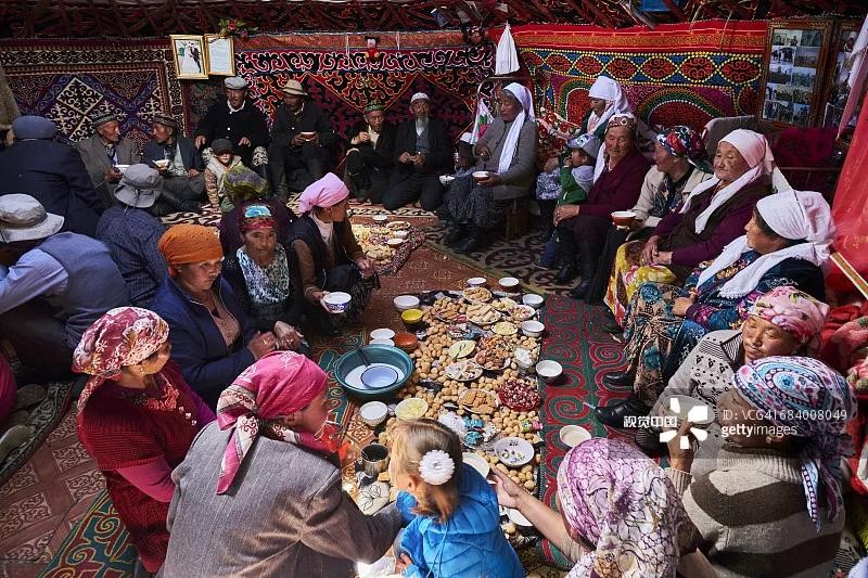 ▲哈萨克族在节日中欢聚一堂,共享美食。