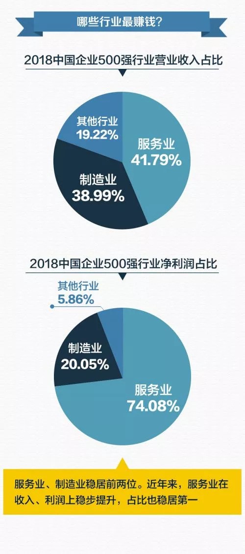 2018中国企业500强中,170家服务业企业共实现营业收入29.74万亿元,占全部500强营业收入总额的41.79%,与2017中国企业500强相比,占比下降了0.88个百分点,但仍超过了制造业占比,继续稳居第一。