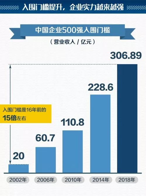 2018中国企业500强的入围门槛为306.89亿元,较2017中国企业500强入围门槛大幅提高了23.78亿元,这是中国企业500强入围门槛首次突破300亿元大关。与2002年相比,入围门槛已经提高了286.89亿元,年平均提高17.93亿元。