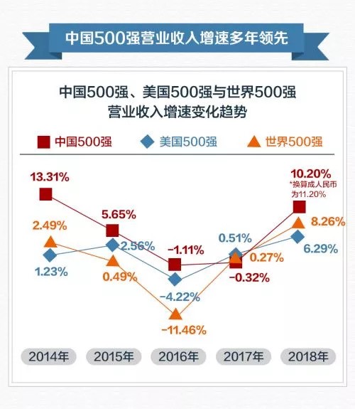 2018中国企业500强共实现营业收入71.17万亿元,比上年增长了10.20%,换算成人民币则增长了11.20%,而同期2018世界500强营业收入增长了8.26%,2018美国500强的营业收入仅增长了6.29%。