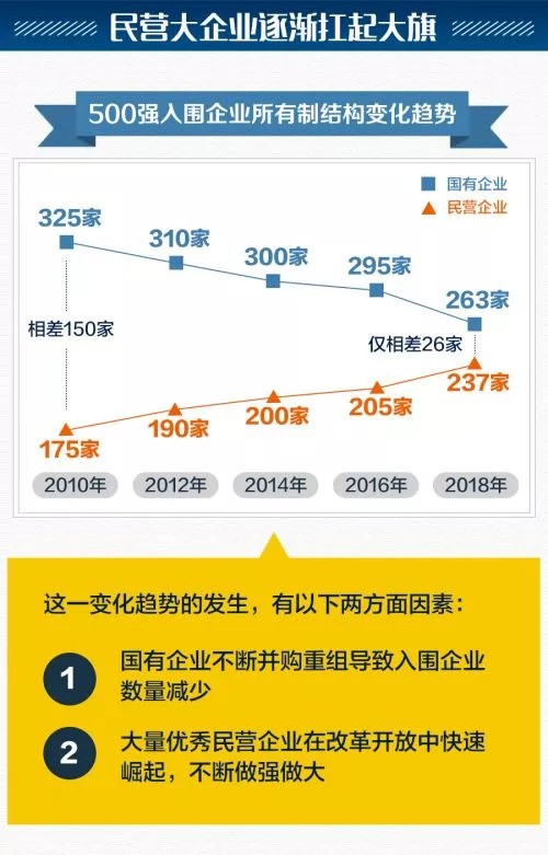 2010中国企业500强中,国有企业、民营企业分别为325家、175家,国有企业比民营企业多150家,截至2018中国企业500强中,国有企业仅比民营企业多26家,按照这一发展趋势,未来几年民营企业入围数量将赶上并超过国有企业。