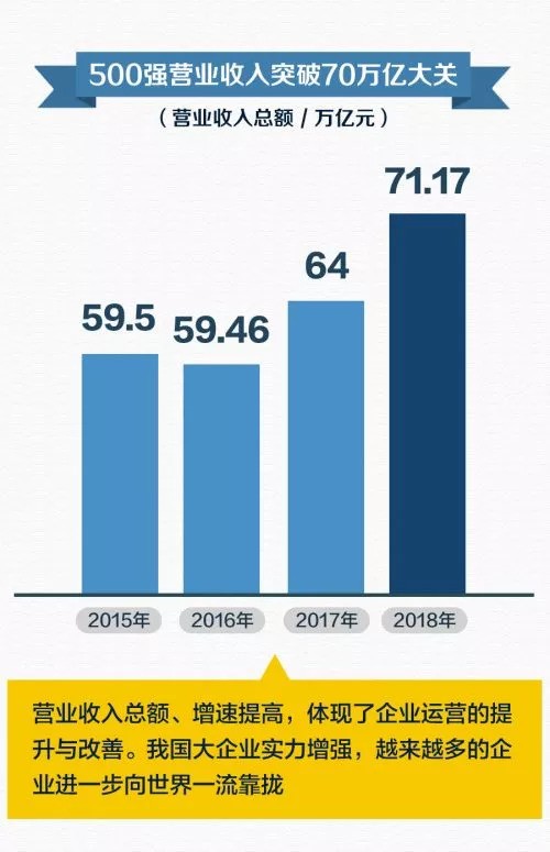 2018中国企业500强共实现营业收入71.17万亿元,首次跃上70万亿元大关。