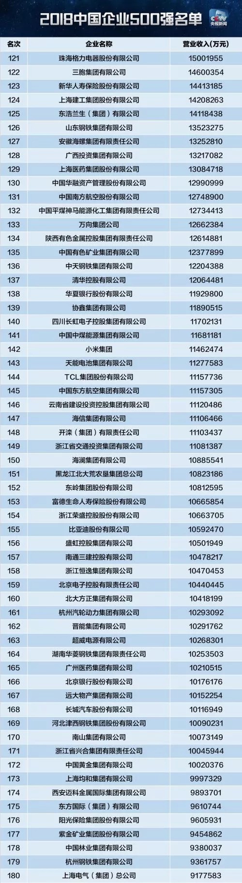 9月2日中国企业联合会、中国企业家协会课题组在2018中国500强企业高峰论坛发布2018中国企业500强分析报告(数据采用2017年)。