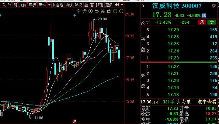 11 月 18 日,汉威科技盘中快速回调,5 分钟内跌幅超过 2%,报 17.63 元,成交 3739.56 万元,换手率 0.74%。