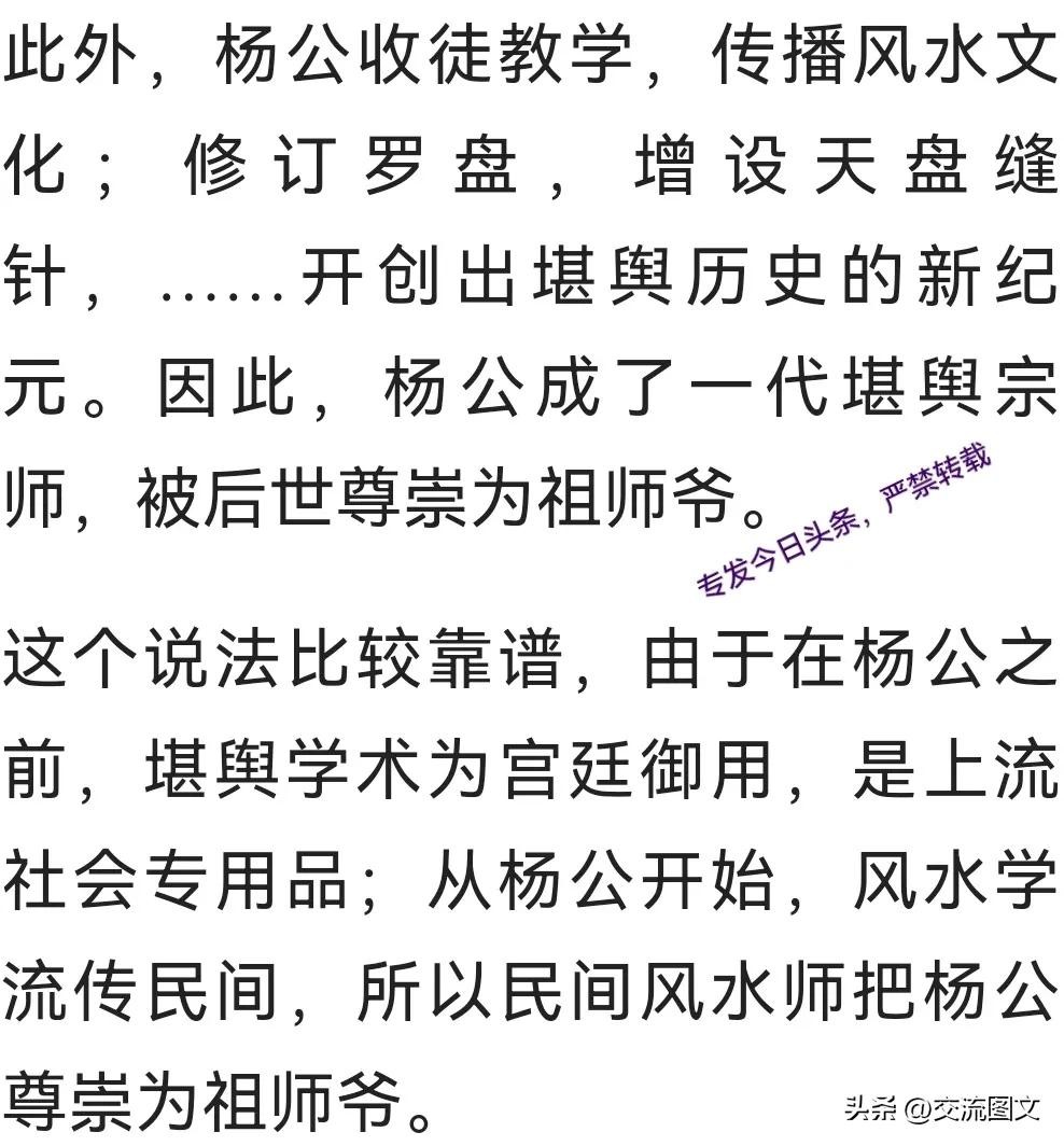 综上所述,杨公真正师父是窃取的皇室堪舆秘籍,而不是人;杨公最先把风水学带到民间,最先在民间传播堪舆学术。因此,只有杨公,才是名至实归、当之无愧的风水祖师爷。