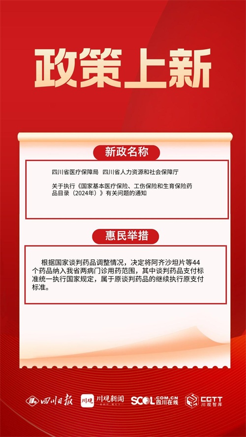 1月1日起,全省基本医疗保险、工伤保险和生育保险全面执行《2024年药品目录》,药品通用名、甲乙分类、剂型和限定支付范围等按照国家规定执行。《2024年药品目录》调出的药品不再执行。协议期内谈判药品和竞价药品执行国家规定的医保支付标准和相关要求。新增的国家集中带量采购中选药品以四川省中选价格作为支付标准。