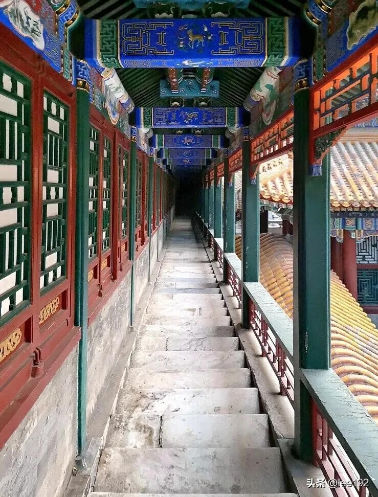 排云殿后是一个方形院落,院落北端直立着一道陡壁,走至其下有泰山压顶之势,双八字楼梯折成<之>字形,通过它们可以登上德晖殿,此路颇陡峭,登之令人气短!幸好旁边有较缓的爬山廊可以较为轻松地再上一层。
