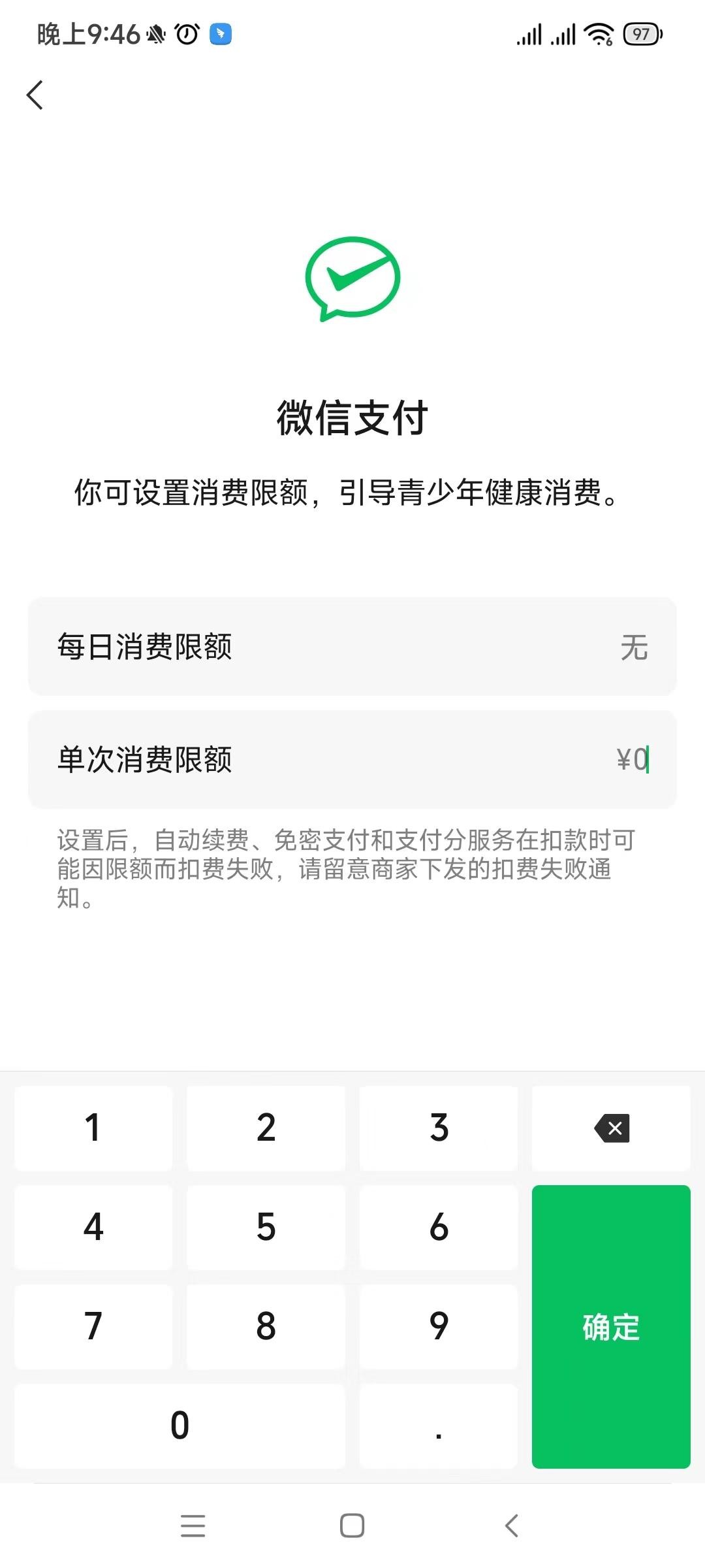 然后进入青少年模式,找到【微信支付】的选项,点该选项进入,可以设定每日消费限额和单次消费限额,额度手动设定,想设多少直接输入数字然后点右下角的确定按钮即可。