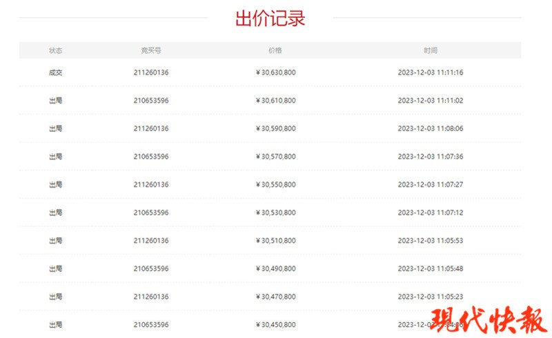 根据出价记录,12月2日10时,拍卖刚一开始便有人举牌,在119.08万元的起拍价上,前5分钟内经历5轮加价。在原定结束时间12月3日10时后,多名竞买人仍在不停出价。在拍卖后半程,主要由两名竞买人竞相出价,最终竞买号211260136的竞买人以3063.08万元的价格成功竞得,约是起拍价的25.7倍,整个拍卖过程出价记录达753次。