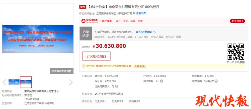 现代快报讯(记者 王新月)近日,南京吴良材眼镜有限公司(下称“南京吴良材”)100%股权在京东拍卖,以3063.08万元成交,约是起拍价的25.7倍。