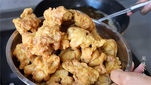 最后将鸡块炸熟,炸到颜色金黄的时候就可以控油捞出来了。时间大约是5分钟,鸡块炸好后,放一旁备用。