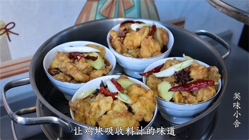 准备几个碗,然后把刚才炸好的鸡块分别放进碗里,每个碗里都放上一片葱段和生姜片,2个干的红尖椒,1个八角,再放几粒花椒。然后每个碗里加入2大勺刚才调好的料汁进去(八分满)。