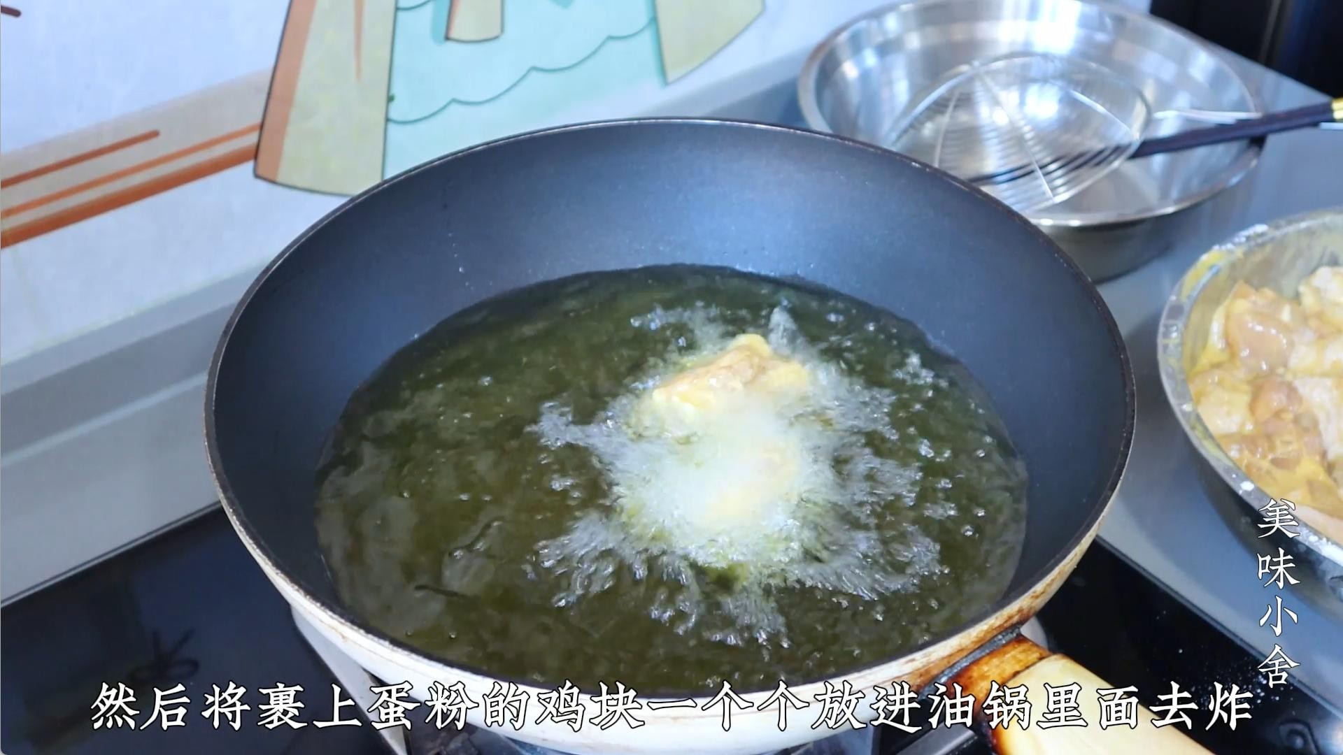 3. 然后将裹上蛋粉的鸡块一个个放进油锅里面去炸,鸡块刚放进油锅就会被炸的起酥。等鸡块炸至定型后,再用筷子搅动搅动,防止粘连在一起。