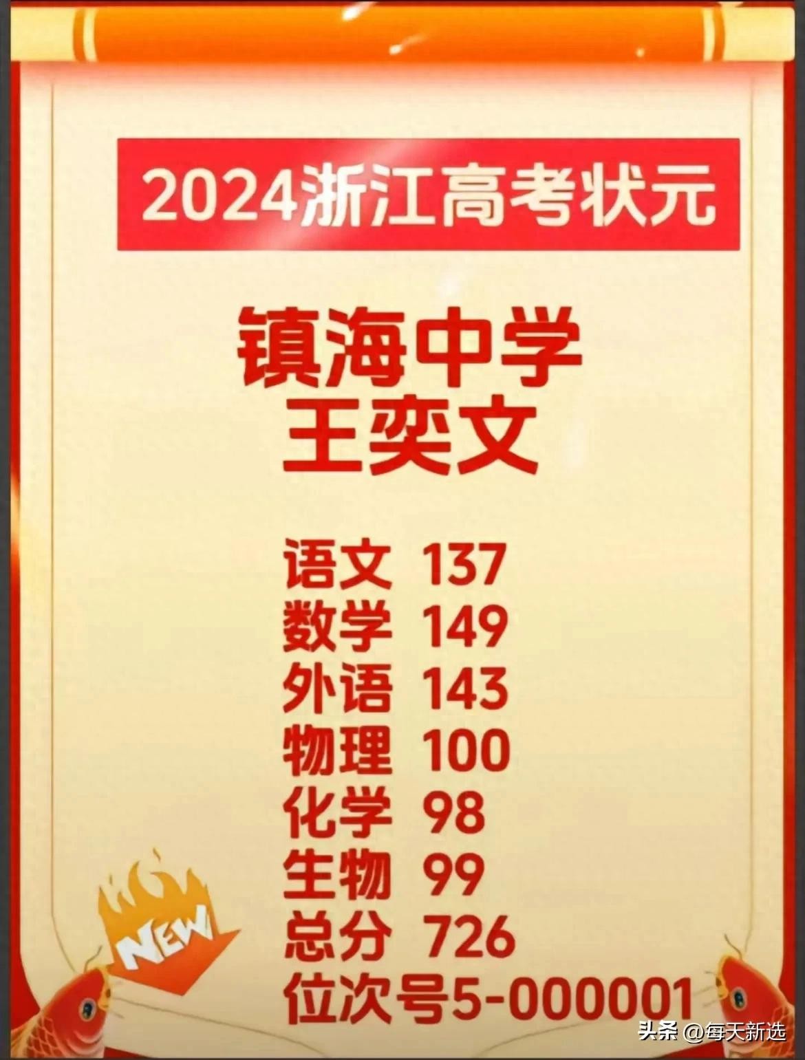 这位浙江高考状元名叫王奕文,是一名女生,来自宁波镇海中学。今年高考成绩726分!凭借拔尖的分数成功拿下浙江的高考状元,真是替她感到骄傲,为王奕文点赞!