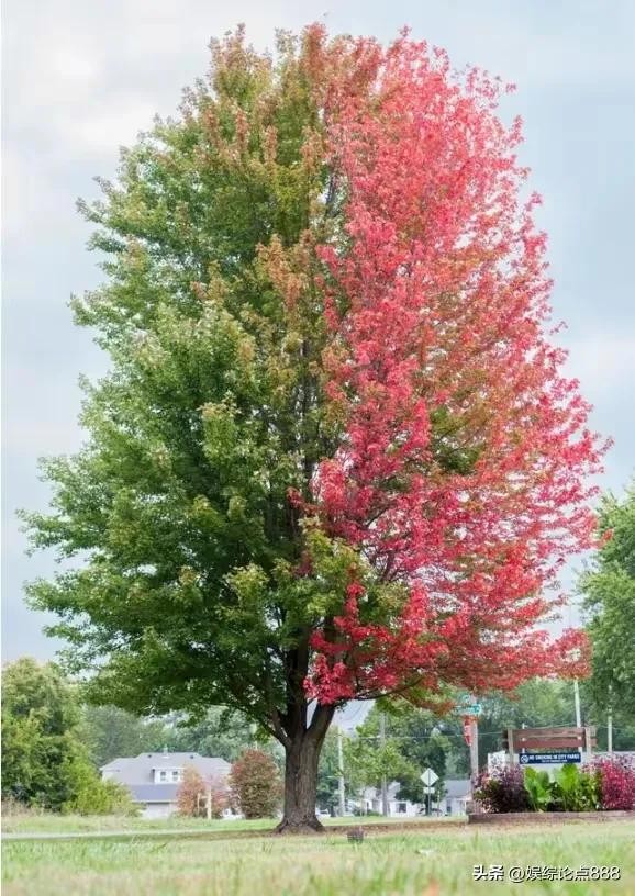 这棵大树一半披翠绿,生机盎然;一半着嫣红,鲜艳夺目,真是神奇又美丽。