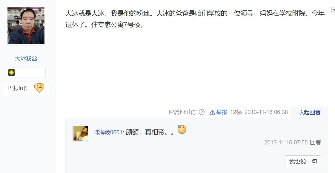 而在大冰走红的时候,大冰父亲曾经希望大冰来学校参加活动,不过大冰当时不愿意去,为此大冰的父亲还给同事吐槽过。