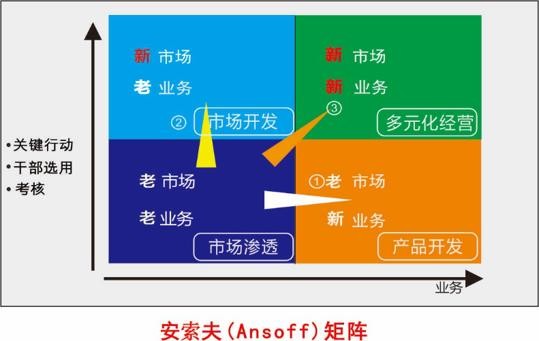 安索夫矩阵(Ansoff Matrix),又称又称为产品市场方格、产品市场扩张方格、成长矢量矩阵。安索夫于1975年提出。该矩阵以产品和市场作为两基本面,区别出四种产品与市场的组合和相对应的增长战略路径,基本象限为:市场渗透;产品开发、产品延伸、多元化经营。
