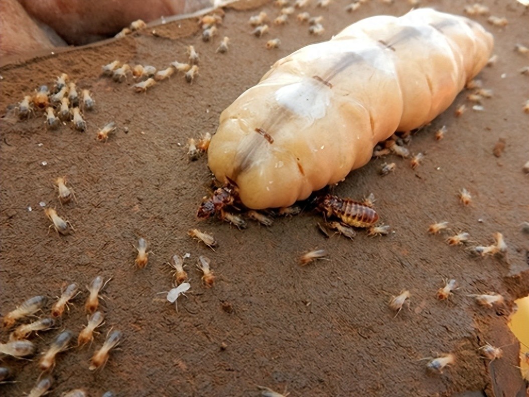 折断自己手脚和翅膀的蚁后就不能再移动了,随着时间的推移,它的腹部会变长、变大,蚁后的体型是普通蚂蚁的5倍大,肚子占了身体的90%。有工蚁提供食物后,蚁后就待在巢穴里安心生育,巅峰时期一只蚁后能产3万枚卵,这些卵会被工蚁搬到专门的巢穴孵化。
