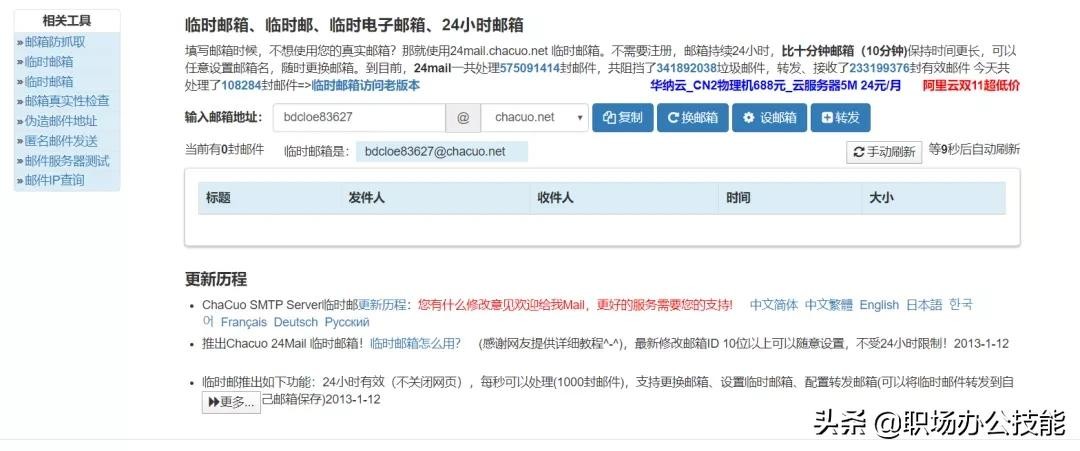 网址:ccccccc/lvlqcc3mgy5 >这是一款提供24小时临时邮箱地址的网站。有一些网站需要用到邮箱地址注册时,就可以用上它,这样就不会暴露我们自己真实的邮箱,从而也就不会收到信息骚扰。