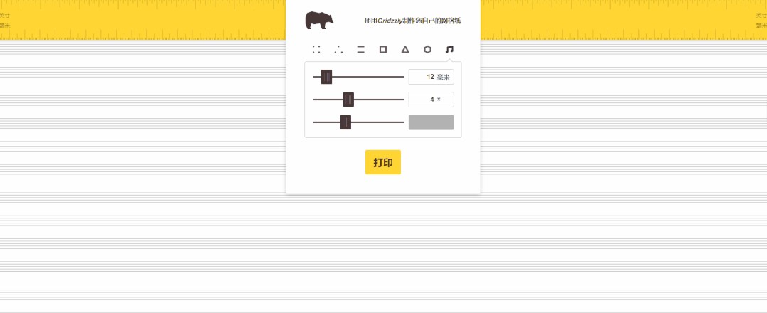 这是一个支持在线设定和打印网格纸的工具,支持点、线、正方形、横线、六边形等不同图案的设置并打印到A4纸张上来,同时还有标尺来测量长度。