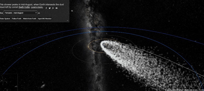 它可以在线以3D太空视角观看流星雨Meteor showers,可以缩放网页来调整远近距离,还可以用鼠标滑动调整角度,近距离地观察流星雨的形成,感觉非常震撼。