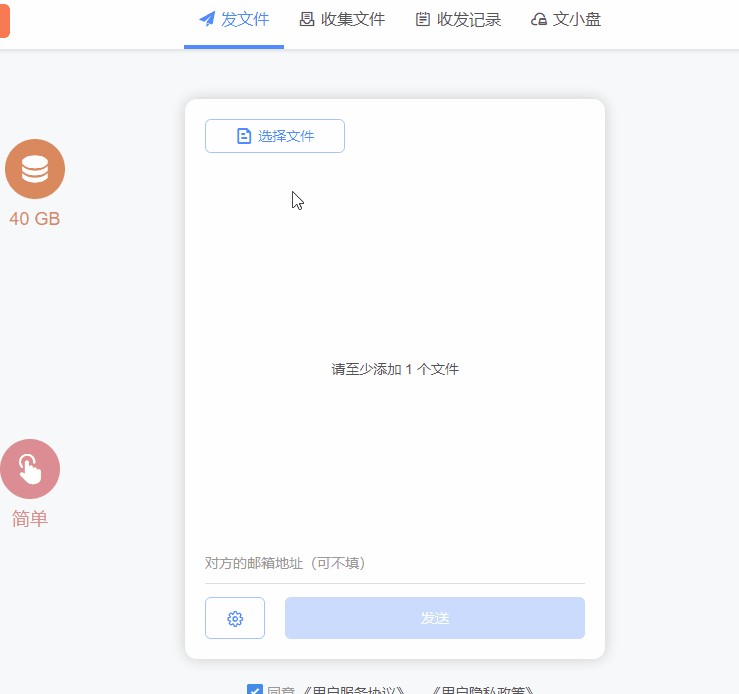 使用起来非常方便,假如我要把一份文件发送到好友的邮箱,操作界面直接添加文件,输入对方的邮箱即可发送,发送的文件会通过邮箱或手机通知对方。
