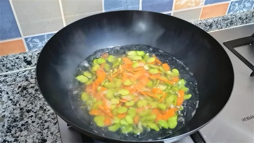 4,锅中加适量水,下入蚕豆米焯水30秒,再下入胡萝卜片继续焯水30秒。捞出沥干水分。