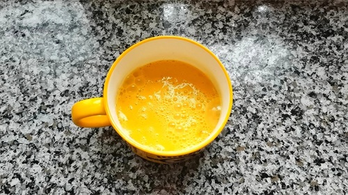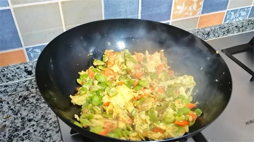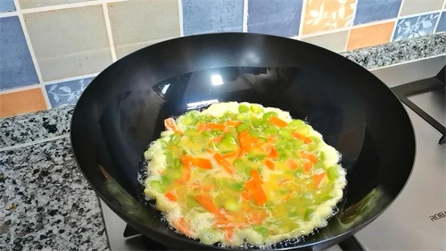 6,锅中加适量的油,倒入蛋液,中小火煎至定型再给它翻个面,两面金黄后再给它稍微炒散一点。